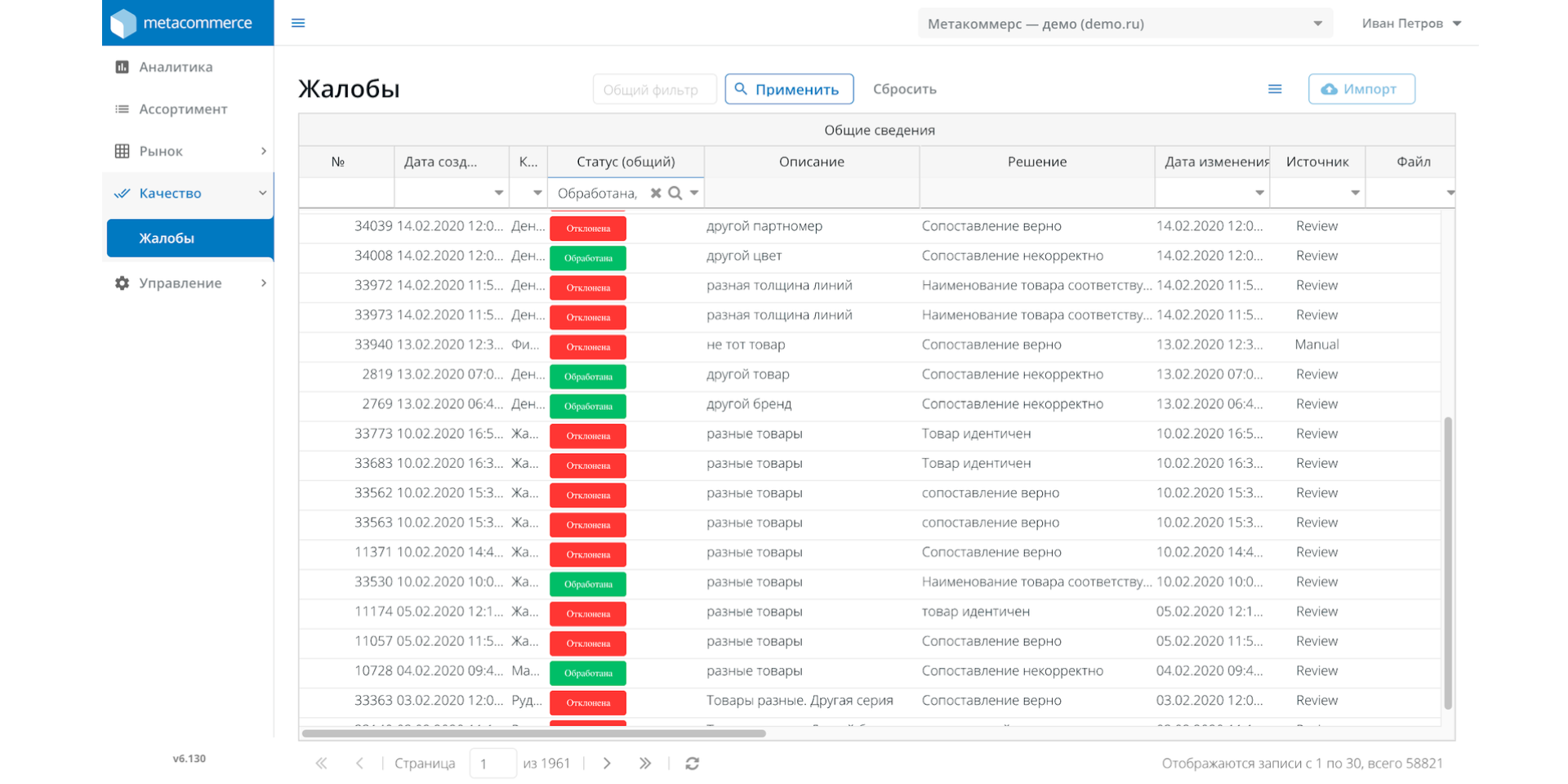 Решение: для решения бизнес-задач клиента были построены процессы автоматизации сбора и анализа данных, в том числе ассортиментного анализа конкурентов, генерации отчетов для различных подразделений внутри компании и передачи данных заказчику. Для каждого из 58 000 товаров в ассортименте заказчика были созданы карточки товара в каталоге Metacommerce, хранящие подробную информацию о продуктах и характеристиках, необходимую для последующего сопоставления и анализа.