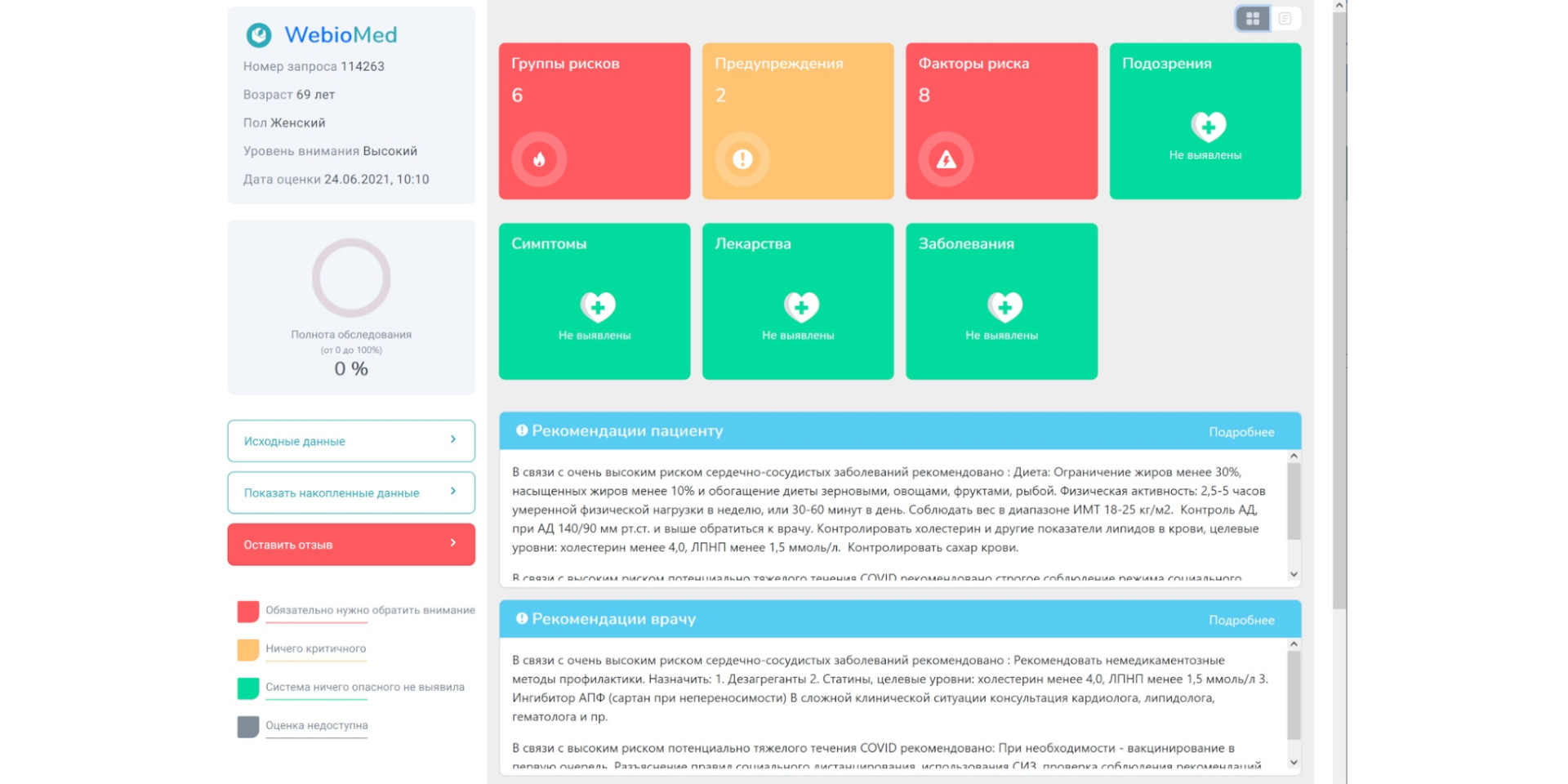 Результат: Проведено сравнительное исследование точности выявления факторов риска и оценки группы риска развития сердечно-сосудистых заболеваний. Выявлено, что в среднем врачи дают точную оценку этих данных в 51% случаев, СППВР Webiomed дает точность 99% при условии полноты и корректности поданной на анализ информации. Проведение ретроспективное исследование оценки результатов диспансеризации за 2018 г. Выявлено, что в 63,2% случаев врачи пропускали имеющиеся у пациента факторы риска. Проведена проверка правильности оценки абсолютного риска смерти от сердечно-сосудистых заболеваний у пациентов в возрасте от 40 до 65 лет. Исследование выявило, что правильная оценка была поставлена в 37% карт диспансеризации. В 61% случаев эта оценка была занижена и лишь в 2% – завышена по сравнению с правильной оценкой, формируемой СППВР Webiomed.